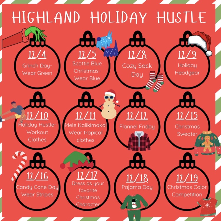 The Highland Holiday Hustle begins on Thursday! The Christmas spirit is strong at HES and we can't wait to see everyone's Holiday gear! 🎄